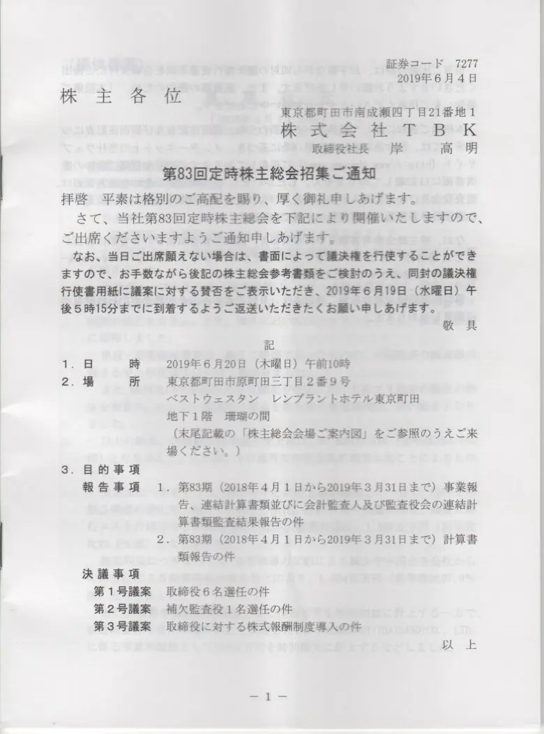 2019年6月8日 / 最終更新日時 : 2019年6月8日 shizuyan TBK定時株主総会招集通知2019 001FacebookXBlueskyHatenaCopyコメントを残す コメントをキャンセルメールアドレスが公開されることはありません。 ※ が付いている欄は必須項目ですコメント ※名前 ※ メール ※ サイト 次回のコメントで使用するためブラウザーに自分の名前、メールアドレス、サイトを保存する。