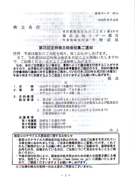 2020年5月16日 / 最終更新日時 : 2020年5月16日 shizuyan リソー定時株主総会招集通知2020FacebookXBlueskyHatenaCopyコメントを残す コメントをキャンセルメールアドレスが公開されることはありません。 ※ が付いている欄は必須項目ですコメント ※名前 ※ メール ※ サイト 次回のコメントで使用するためブラウザーに自分の名前、メールアドレス、サイトを保存する。