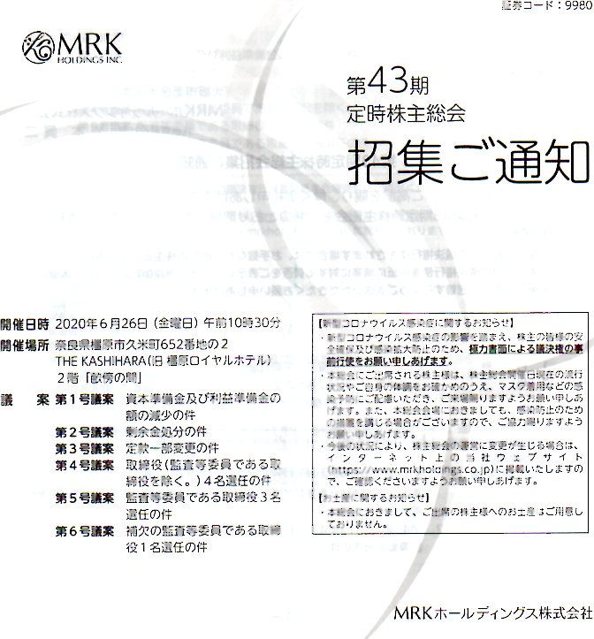 2020年6月15日 / 最終更新日時 : 2020年6月15日 shizuyan MRKHD2020定時株主総会招集通知①FacebookXBlueskyHatenaCopyコメントを残す コメントをキャンセルメールアドレスが公開されることはありません。 ※ が付いている欄は必須項目ですコメント ※名前 ※ メール ※ サイト 次回のコメントで使用するためブラウザーに自分の名前、メールアドレス、サイトを保存する。